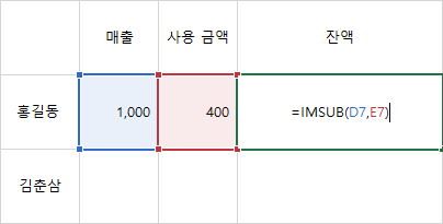 위와 같이 잔액을 구하고자할때! 'IMSUB' 함수를 이용하여 빼기를 구하는 방법입니다.