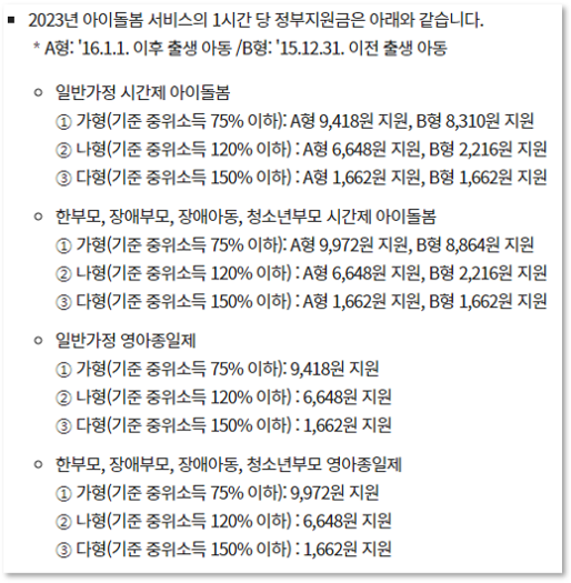 아이돌봄 서비스의 1시간 당 정부지원금은 아래와 같습니다.