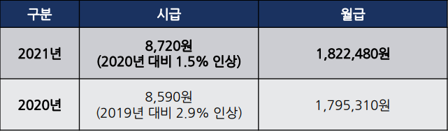 2021년 최저임금 시급은 바로 8,720원으로 정해졌으며, 2021년 최저임금 월급은 1,822,480원입니다.