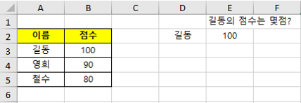 1. D2(길동)의 점수를 E2 셀에서 값을 찾고싶다!